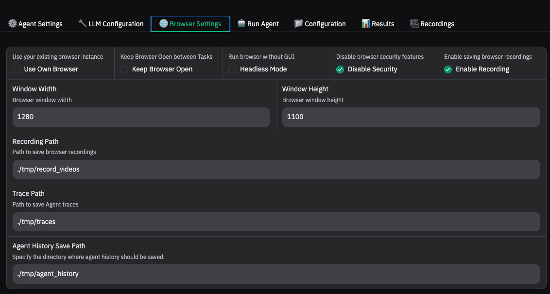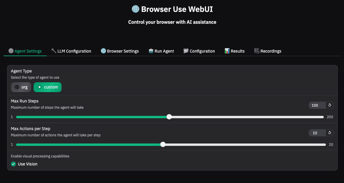 Agent Type: "org" is standardized, while "custom" appears to be more flexible like we did as choosen open source model. Max Run Steps: Maximum number of steps the agent will take. Max Actions Step: Maximum number of actions the agent will take per step. LLM Provider: AI Service Provider that runs your moldel, in our case we would like to run locally, Ollama. LLM Model: Injection of model what you want API Key: If you would like to get response from paid/free AI Services you need to write your api key to access. Browser Settings: Web-UI has an option to run your test on Chromium, Firefox etc. And also