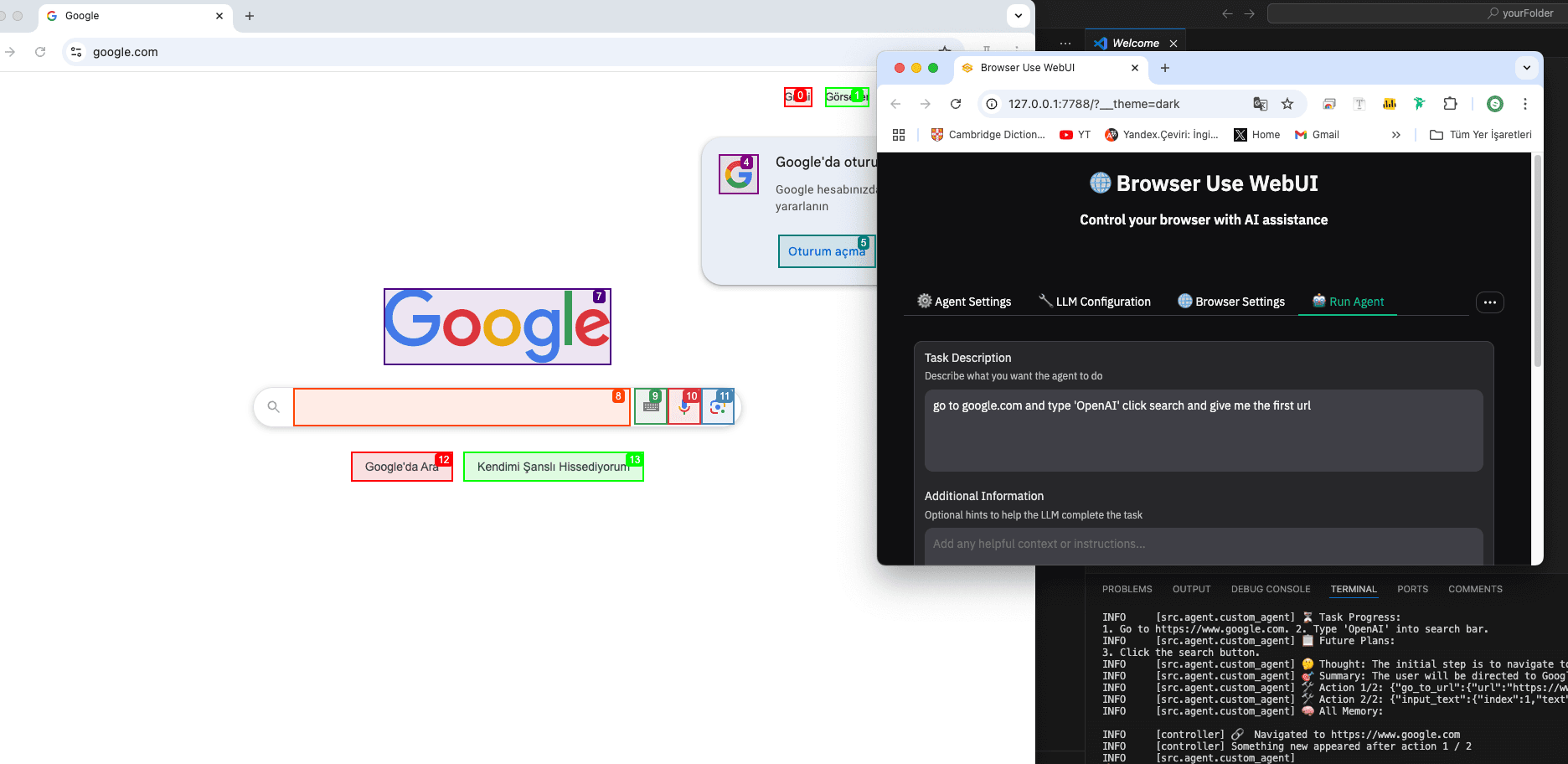 Note 1: Browser-use web-ui is not fully compatible with whole models or models' in terms of validation of unexpected response. At this stage, I recommend you to use Deepseek R1:7B. Also, in order to check system functionallity, you may get an Gemini API from Google AI Studio and run the agent with default prompt (Go google.com and search OpenAI, return first url etc.)